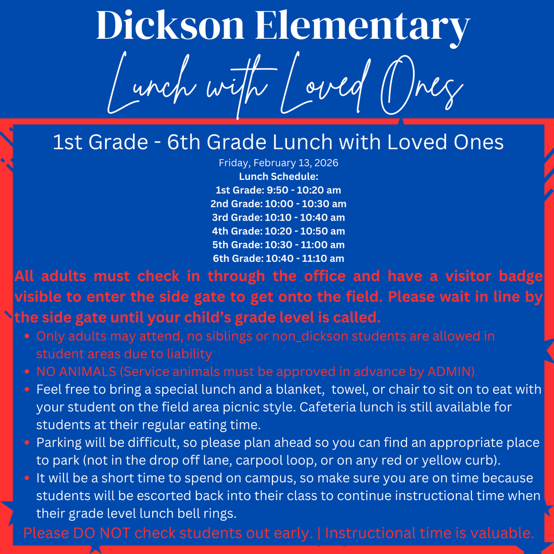 Dear Families,This is a friendly reminder about a few important dates coming up on our school calendar: Friday, February 13 – Minimum Day and Lunch with Loved Ones for students in grades 1–6 (impor...